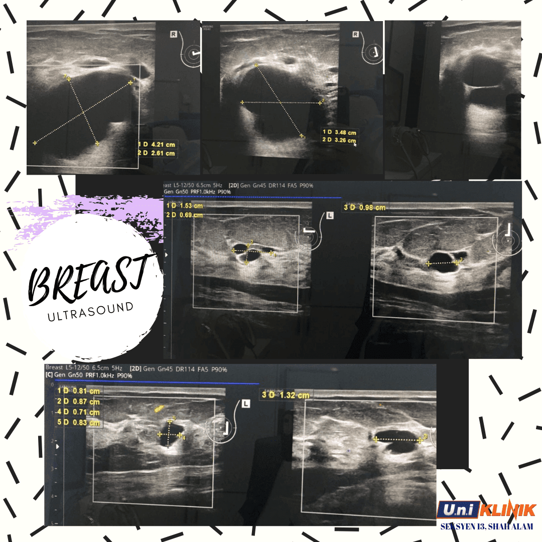 Seorang pesakit datang ke klinik kami hari ini untuk pemeriksaan payudara kerana perasan satu benjolan di kawasan payudara, pemeriksaan payudara dan ultrasound yang dilakukan oleh Dr Rugaiyah hari ini, menyatakan terdapat ketulan-ketulan antara 0.5cm hingga 4cm seperti yang ditunjukkan gambar di atas. Ketulan payudara, Kemungkinan diagnosis: kanser payudara, fibroadenoma, cysts.