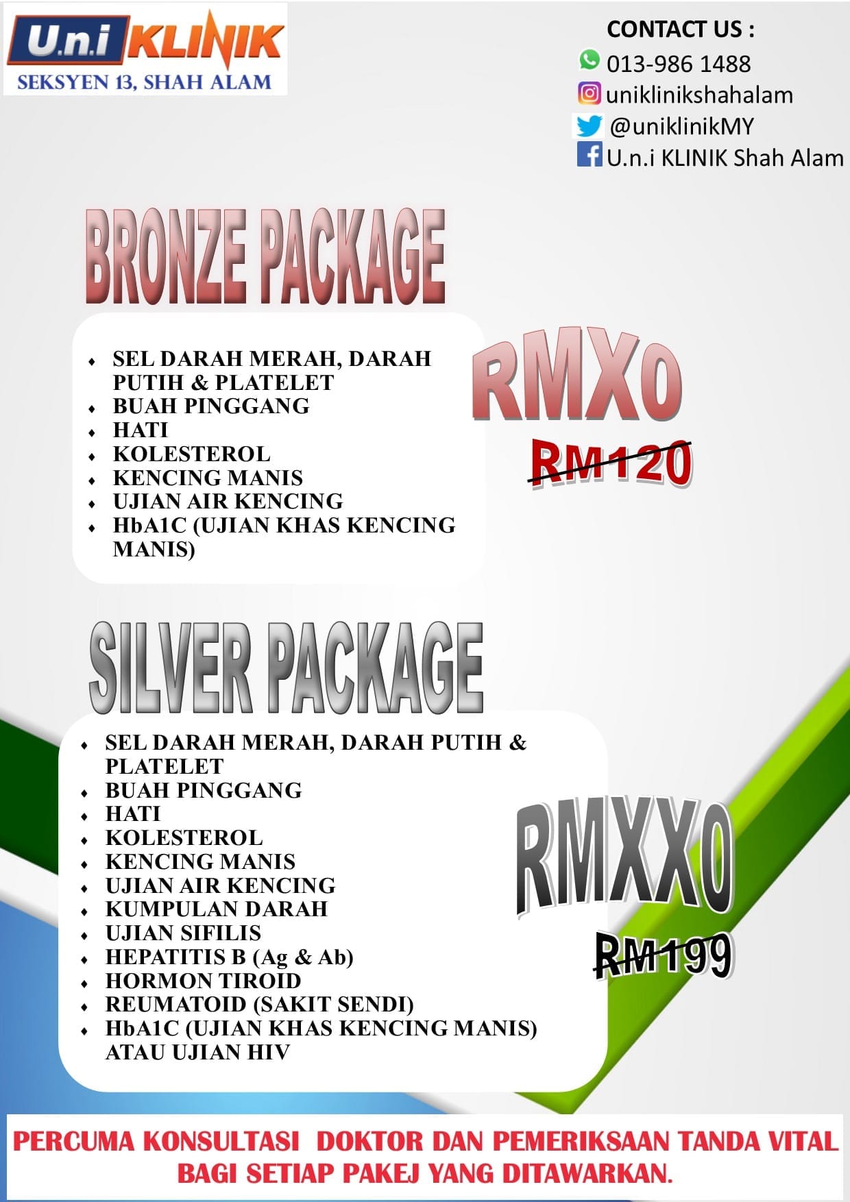 Di U.n.i KLINIK SEKSYEN 13, SHAH ALAM, kami ada banyak pilhan pemeriksaan kesihatan dari yang paling asas sehingga yang paling komprehensif.